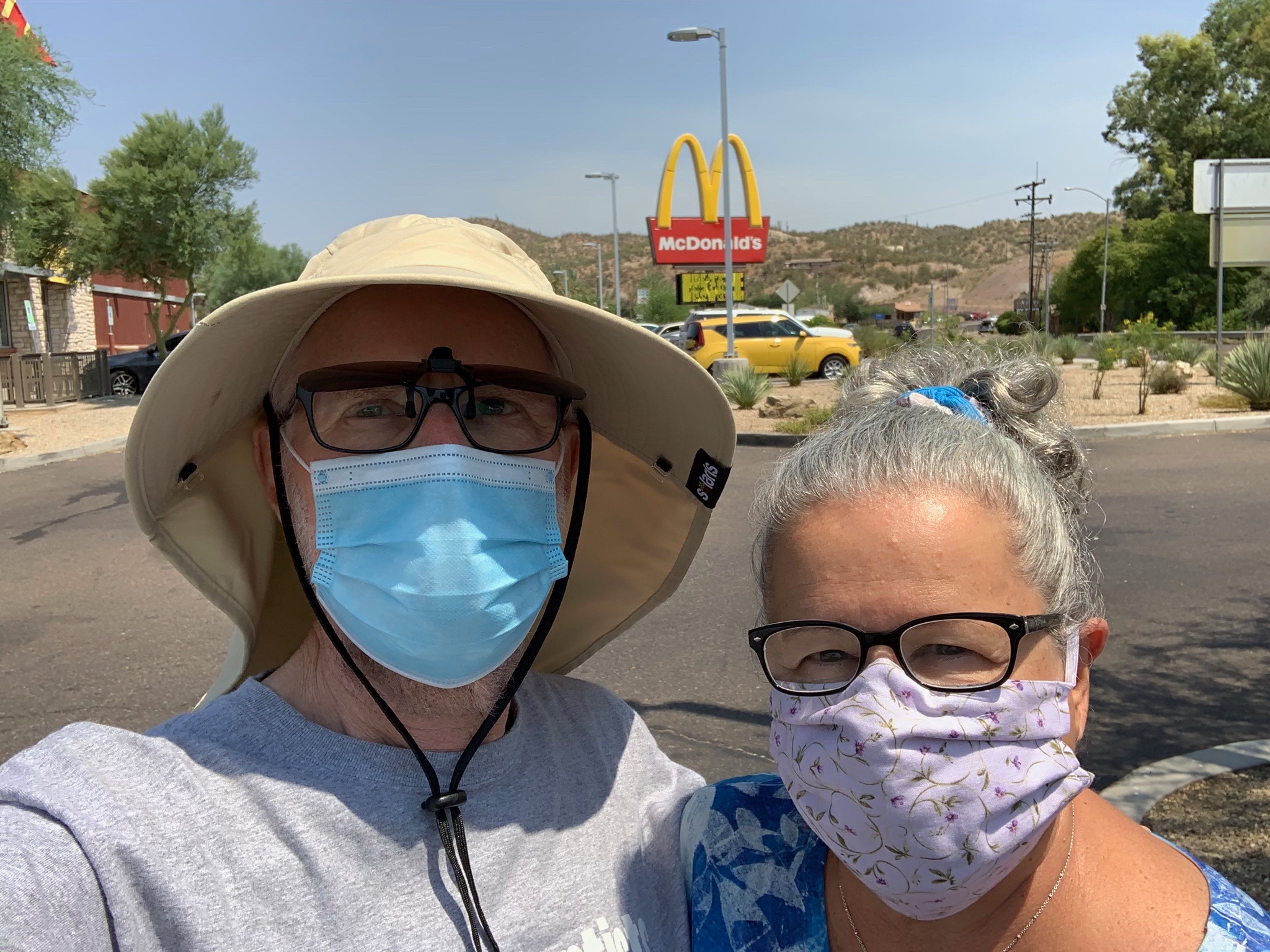 UploadedCelebrating our fifty-fifth anniversary with masks at the Wickenburg, Arizona, McDonalds after all other restaurants had been closed.