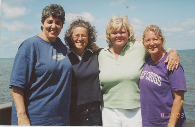 UploadedVicki with DWU friends: MJ Bienvenu, Vicki, Marilyn Smith, and Lisa Flynn at the Hurwitz lake house on Lake Ontario, New York.