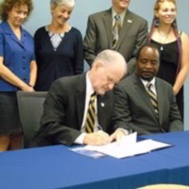 Signing a cooperative agreement with a community college to provide interpreter training support while Dean Isaac Agboola and other faculty and staff look on.