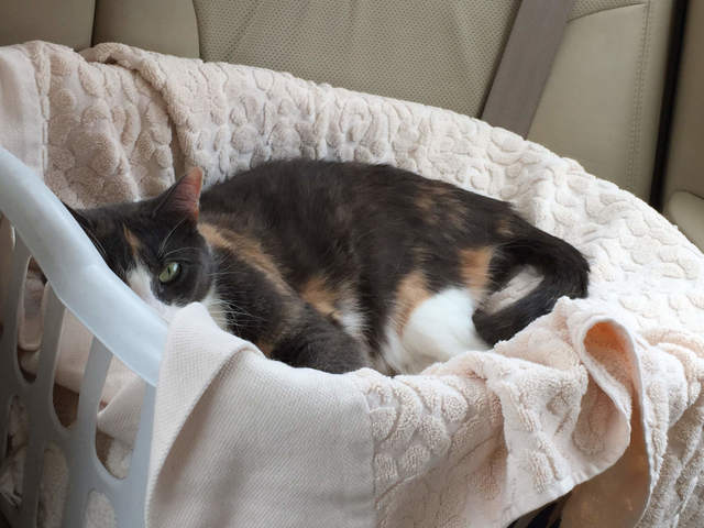 UploadedSophia in her basket in the back seat during our drive back to Rochester from DC.