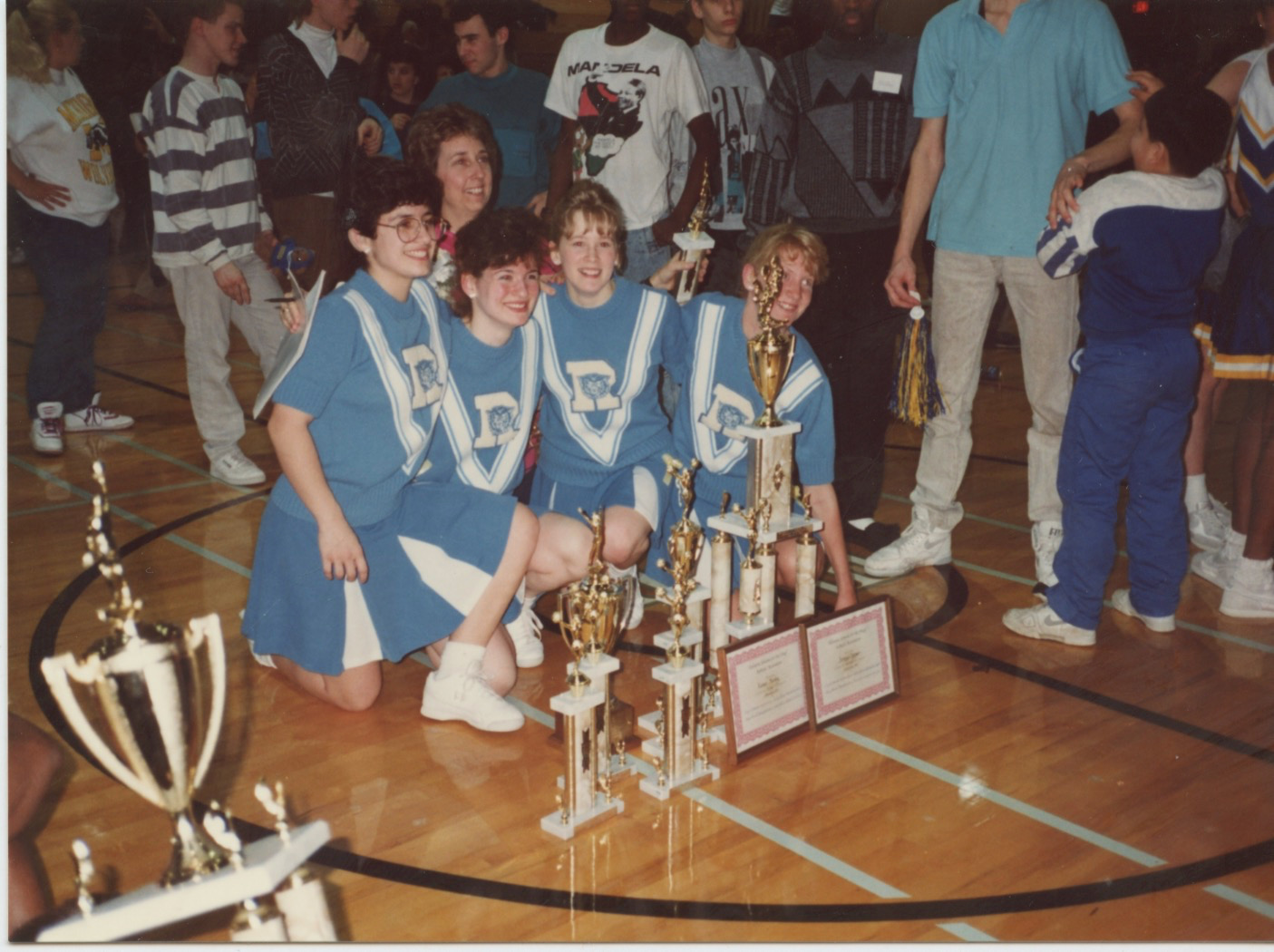 UploadedStefi with her cheerleading team after winning the championship at a tournament: Stefi, Jenny Clupper, Karen Kirby, and Shelly Dew with Paula Hanson as the coach.