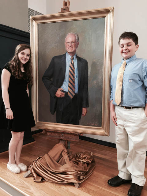 Susan Juliette and Ethan standing next to Grampa’s presidential portrait at its unveiling.