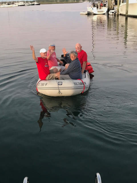 Tom Peets steers a dinghy with Merle Reekers, Vicki, and me as passengers during the Deaf Sailing Cape Cod trip.