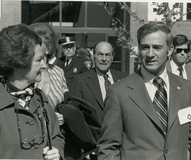 Dr. Frisina with Lady Bird Johnson at the dedication of the Johnson building at NTID. Courtesy of RIT Archive Collections, Rochester Institute of Technology