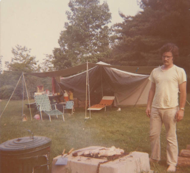 Grilling chicken in front of our canvas tent.