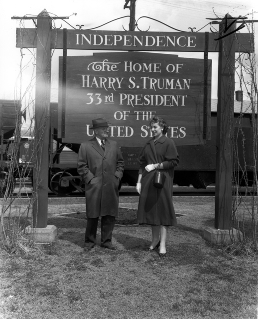 President Harry S. Truman stands before a sign in his hometown of Independence, MO.