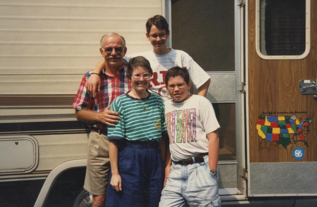 The Reekers family in front of their RV in which we traveled with them in Florida: Merle, Scott, Susan, and David.