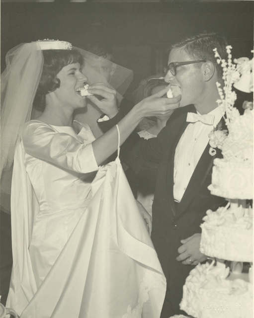 Vicki and I (gently!) feeding one another with slices of our wedding cake.